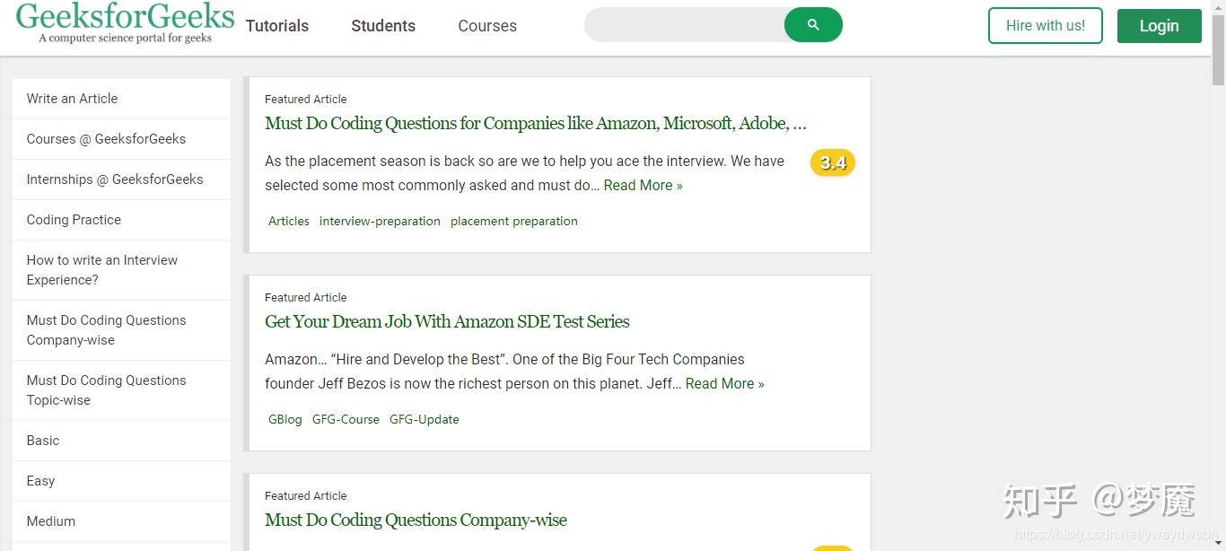 关于算法和数据结构,GeeksforGeeks 有很多好的文章、解释和代码解决方案。如果你正在准备一个面试,也可以用这个网站准备和复习更难的算法问题。
